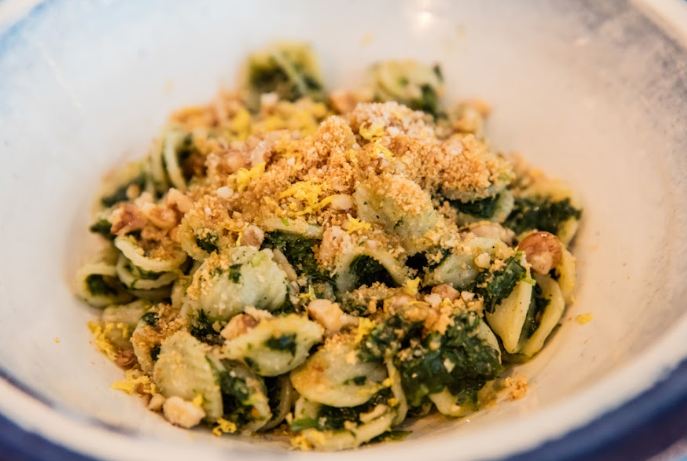 Na região de Puglia a massa mais é o orecchiette, que significa “pequenas orelhas”. A receita tradicional leva folhas de nabo (cime di rapa), alho, anchovas e azeite de oliva. É uma combinação de sabor levemente amargo das verduras com o salgado das anchovas!