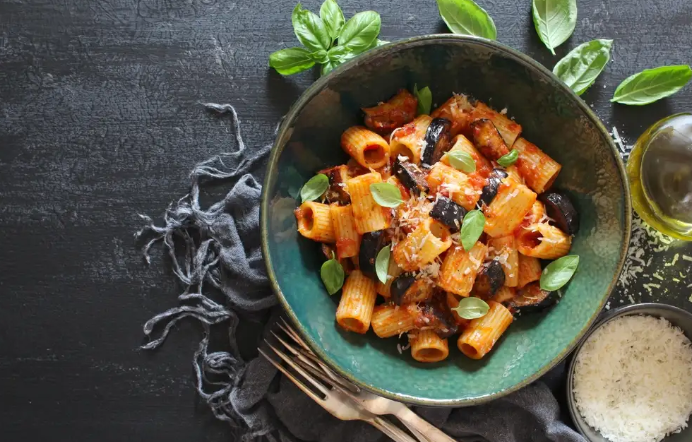 A pasta alla Norma é um dos pratos mais famosos da Sicília. Leva berinjelas fritas, molho de tomate fresco, manjericão e queijo ricotta salata ralado. É uma receita simples, mas cheia de personalidade, criada em homenagem à ópera Norma, de Vincenzo Bellini!
