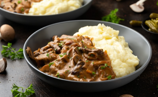Feito com strogonoff de carne preparado com Creme de Ricota Galbani, cogumelo paris, cebola, alho, mostarda, ketchup, extrato de tomate, molho inglês e pimenta do reino. O strogonoff é sinônimo de receita simples, prática e econômica! Na nossa versão, o strogonoff é servido com purê de batata para se transformar em uma receita econômica diferente e muito saborosa!