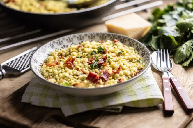 No Brasil, o risoto muitas vezes é servido como acompanhamento para carnes, frangos ou peixes. Mas, na tradição italiana, ele é um prato principal, servido sozinho e pensado para ser completo em sabor e textura.