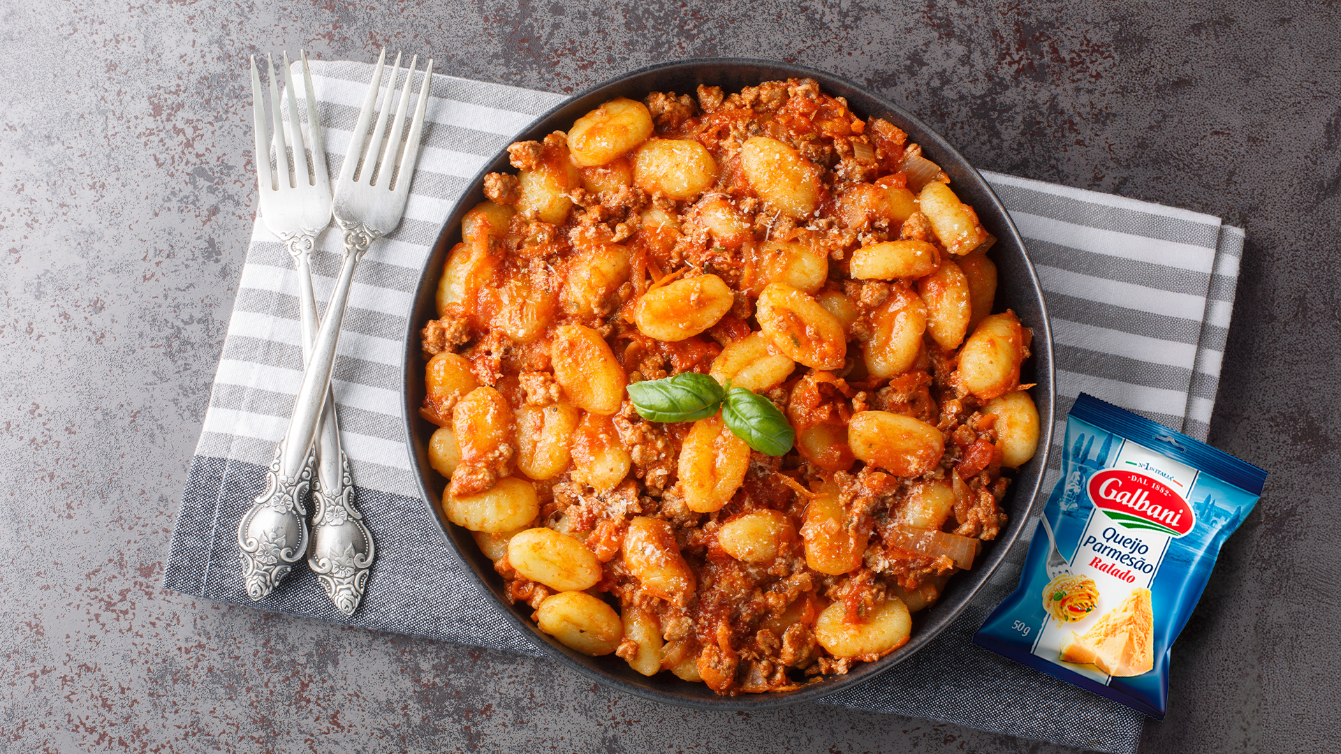 Nhoque italiano de batata cozido e servido com molho bolonhesa preparado com carne moída, passata de tomate, legumes e a casca do queijo Parmesão Galbani. Finalizado com queijo Parmesão Galbani ralado.